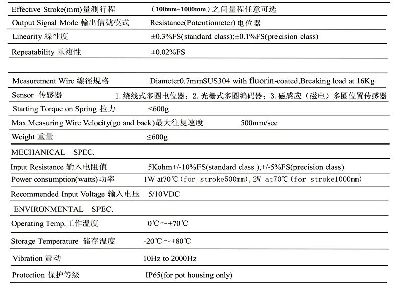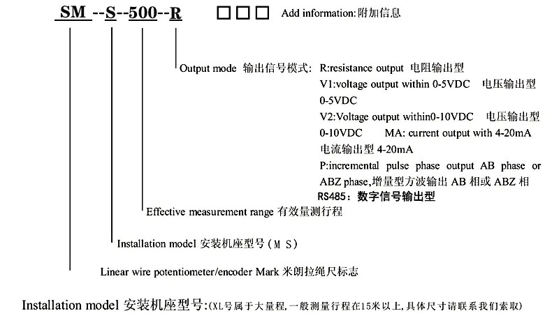 SM-S型拉線位移傳感器,又稱拉繩編碼器,拉繩尺,拉線尺,拉線編碼器,拉繩位移傳感器,是直線位移傳感器在結構上的精巧集成,充分結合了角度傳感器和直線位移傳感器的優點,成為一款結構緊湊、測量行程長、安裝空間尺寸小、具有高精度測量的優良傳感器。SM型拉線位移傳感器具有很大的選擇空間,行程從200mm至20000mm不等, 具有模擬電流信號mA:4-20mA,模擬電壓信號V1:0-5V,V2:0-10V,脈沖信號P:A、B、Z相數字輸出,數字信號RS485。滿足大行程、高精度各種信號需求。