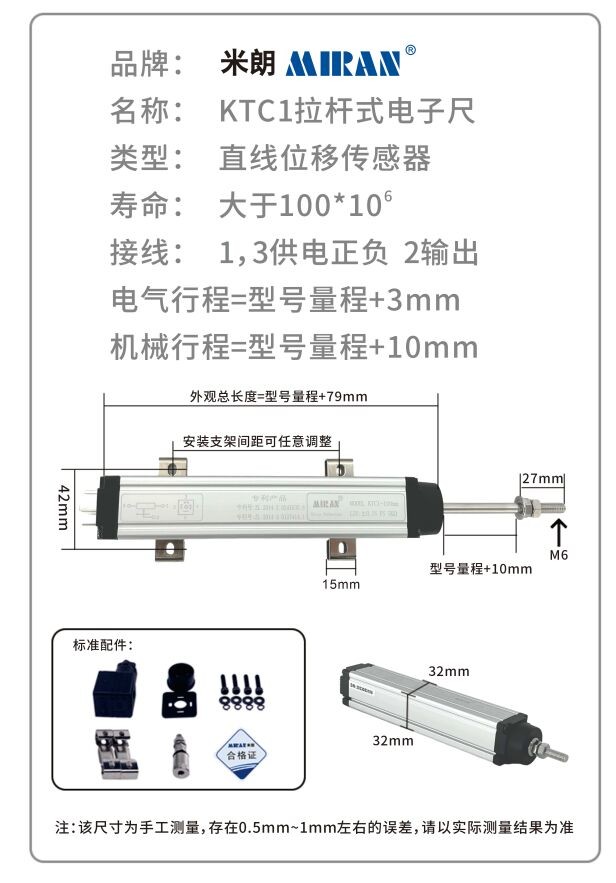 KTC1拉桿式直線位移傳感器(別名:電子尺,電阻尺,電位器,位移傳感器)原理:電位計原理,所有傳感器為位置測量型,用于調節系統(控制系統)和測量系統中,對位移和長度進行直接測量,輸出直流電壓信號,也可以通過內置或者外置的V/A變送模塊講信號轉換成標準的0-5V、0-10V或者4-20mA直流信號,也可以遠距離傳輸控制要求。KTC1拉桿式直線位移傳感器(別名:電子尺,電阻尺,電位器,位移傳感器)輸出位移變化:0-100%給定輸入工作電壓(隨位移變化而變化)。