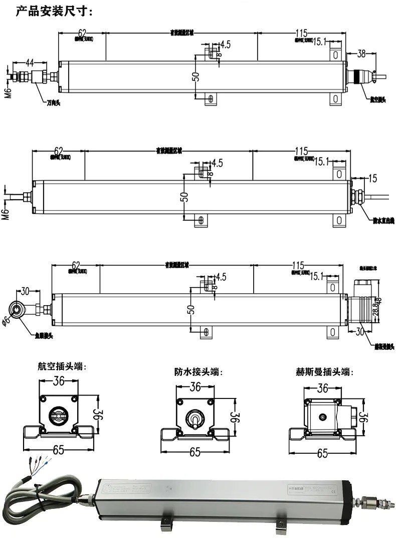 MTG拉桿式磁致伸縮位移傳感器尺寸安裝圖: