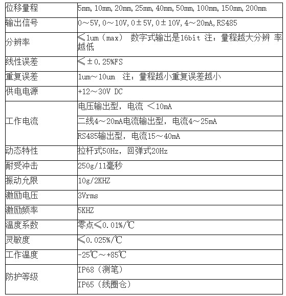 直流LVDT具有優良的性能,采用方便的單電源+12~24V DC供電, 電子電路密封在304不銹鋼金屬管內,可以在潮濕和灰塵等惡劣環境中工作,輸出信號為標準的可被計算機或PLC使用的0~5V, 0~10V,0±5V,0±10V,4~20mA,RS485輸出。