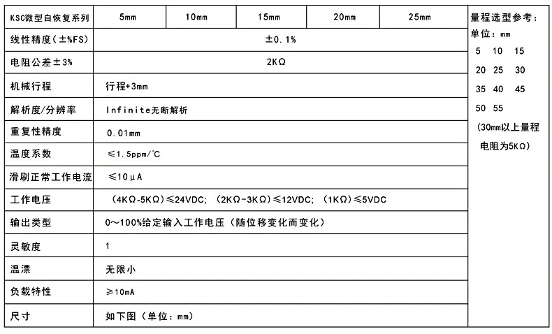 KSC方管微型自復位式位移傳感器(別名:電子尺,電阻尺,電位器,位移傳感器)原理:電位計原理,所有傳感器為位置測量型,用于調節系統(控制系統)和測量系統中,對位移和長度進行直接測量,輸出直流電壓信號,也可以通過內置或者外置的V/A變送模塊講信號轉換成標準的0-5V、0-10V或者4-20mA直流信號,也可以遠距離傳輸控制要求。KSC方管微型自復位式位移傳感器(別名:電子尺,電阻尺,電位器,位移傳感器)輸出位移變化:0-100%給定輸入工作電壓(隨位移變化而變化)。