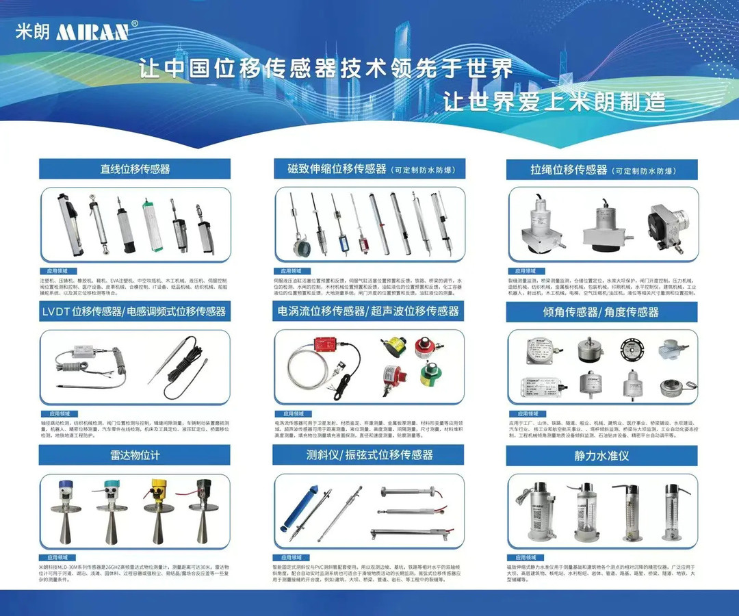 米朗科技這次展出的產(chǎn)品有:“MIRAN米朗、LinecSKI萊茵”系列電子尺/位移傳感器、磁致伸縮位移/液位傳感器、拉繩/線式位移傳感器、LVDT差動變壓位移傳感器、電渦流位移傳感器、磁柵尺、傾角傳感器、角度傳感器、超聲波位移傳感器、測斜儀及測斜管、壓力傳感器、裂縫計、振弦式位移傳感器、配套顯示控制器、靜力水準儀、雷達物位計、輪輻式稱重傳感器等,集中潤滑油泵及相關油路配件等產(chǎn)品。