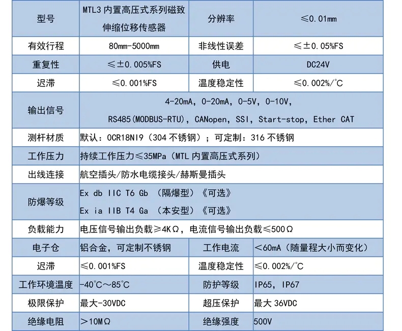MTL3磁致伸縮位移傳感器標(biāo)準(zhǔn)參數(shù):
